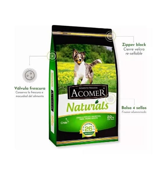 Fabricado En Chile / Acomer Naturals 26% de proteinas, sin colorantes artificiales, envase con cierre de velcro.