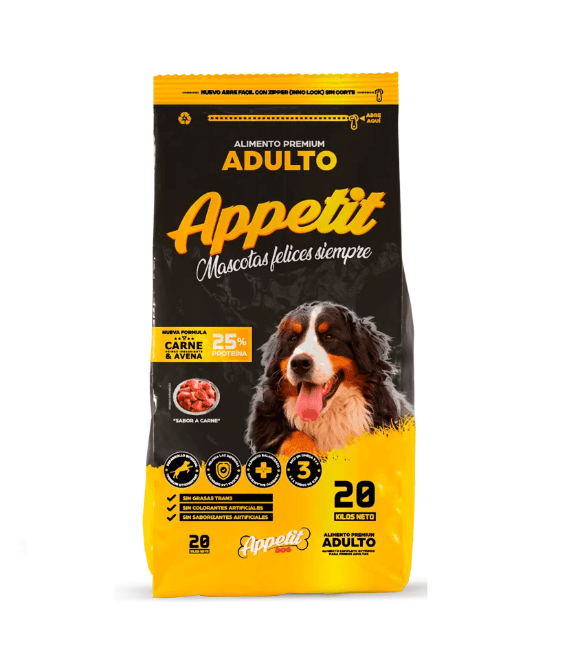 Appetit Adulto es un alimento indicado para perros adultos de todas las razas. Contiene ingredientes balanceados 100% naturales. Disponible en bolsa de 20 Kg.