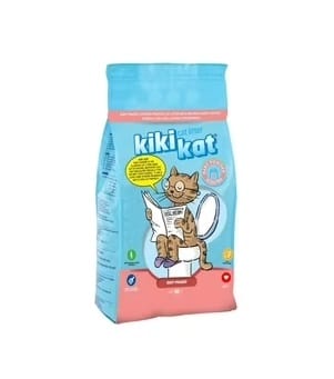 Arena de gato aglutinante Kikikat Talco Bebé, fabricada en Turquia. Absorbe olores, fácil de limpiar y 100% natural. ¡Orden y limpieza al máximo!