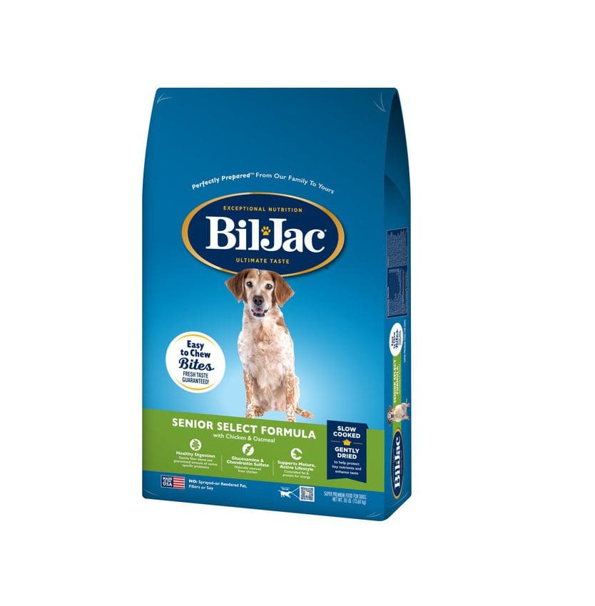 BilJac Senior Select Formula es un alimento para perros especialmente formulado con los nutrientes que necesita su perro senior. Elaborado con pollo y harina de avena y altos niveles garantizados de origen natural de glucosamina y sulfato de condroit