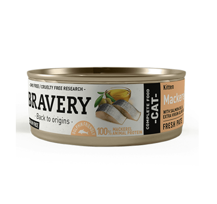 El Bravery Lata Mackerel Kitten Cat 70gr es un alimento complementario para gatitos cachorros. Elaborado con una única fuente proteica, la caballa, que aporta un gran contenido de ácidos grasos Omega 3, vitaminas y minerales que contribuyen a mantener un estado de salud excelente. Producto que ayuda a mantener la piel y pelaje sanos.