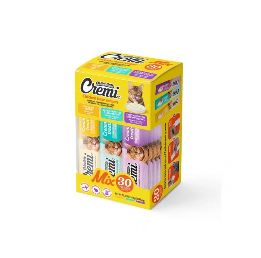 El Naturalistic Cremi Box Chicken ofrece 30 tubos de 12 g cada uno, con sabores que incluyen pollo, pollo/atún y pollo/camarón. Enriquecido con taurina y extracto de té verde, este snack apoya la salud del corazón y proporciona antioxidantes naturales. Su textura suave y alto contenido de humedad ayudan a mantener a tu gato hidratado y satisfecho.