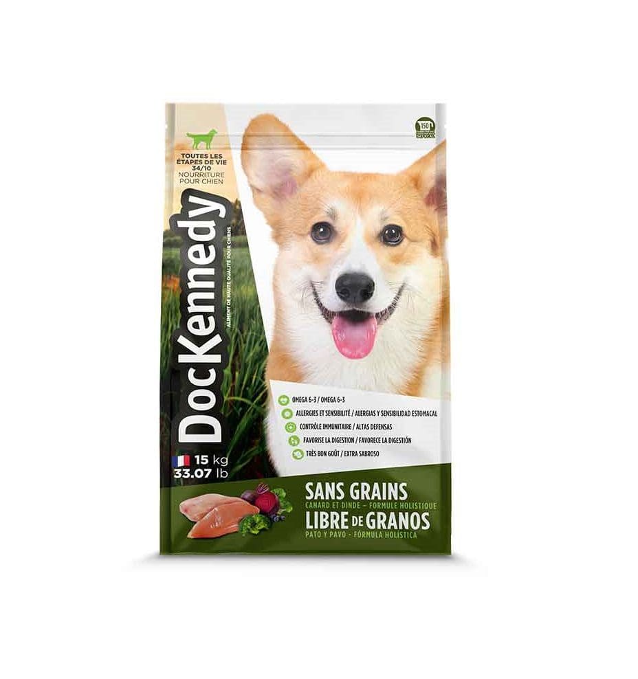 Alimento doc kennedy libre de granos de pato y pavo para perros de todas las edades con primer ingrediente pollo y con proteínas de pavo y pato. Con harina de Krill y aceite de pescado para proveer omega 3 y 6 para cuidado de piel y pelaje