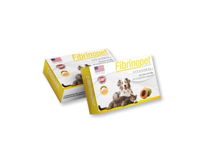 Fibrinopet 300mg es un suplemento nutricional 100% natural, el cual contiene como ingrediente principal Concentrado de Papaya (PAPAINA). Características principale Acción antinflamatoria. Es un potente Antiinflamatorio enzimático, muy útil en el control de hematomas, inflamaciones y edemas producidos por lesiones traumáticas o inflamatorias.Acción Fibrinolitica. Actúa activando el plasminógeno y convirtiéndolo en plasmina, con el objeto de que ésta destruya la fibrina contenida en el trombo. Es por eso que es altamente recomendable en el tratamiento de todo tipo de hematomas. La acción de la papaína como enzima proteolítica consiste en los cambios profundos que produce los tejidos inflamados y edematosos. Actúa como agente de desbridamiento removiendo los tejidos proteicos muertos y ayudando a resolver los exudados purulentos y mucoides, es por eso que es conocido como un potente fibrinolitoco. Posología: Perros: 1 comprimido cada 20 Kg. de peso, 1 vez al día. Gato: 1/4 comprimido al día.