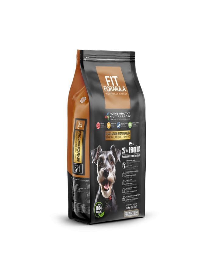 FIT FORMULA® Senior Raza Pequeña, ha sido especialmente desarrollado para mantener y mejorar la calidad de vida de su mascota en edad avanzada. A medida que su perro envejece, el ritmo de su metabolismo disminuye, pierde masa muscular y aumenta su grasa corporal. Baja el tránsito intestinal y la capacidad de absorber nutrientes. La piel pierde elasticidad y se vuelve escamosa. El pelo se debilita, se vuelve seco, sin brillo y comienzan a aparecer las canas. Se degeneran las articulaciones. Decae el sistema inmunológico. Se pierden progresivamente los sentidos de la visión, olfato, oído y gusto. Se degenera el sistema nervioso central, provocando cambios en su comportamiento, desorientación e incapacidad de reaccionar al medio que los rodea.