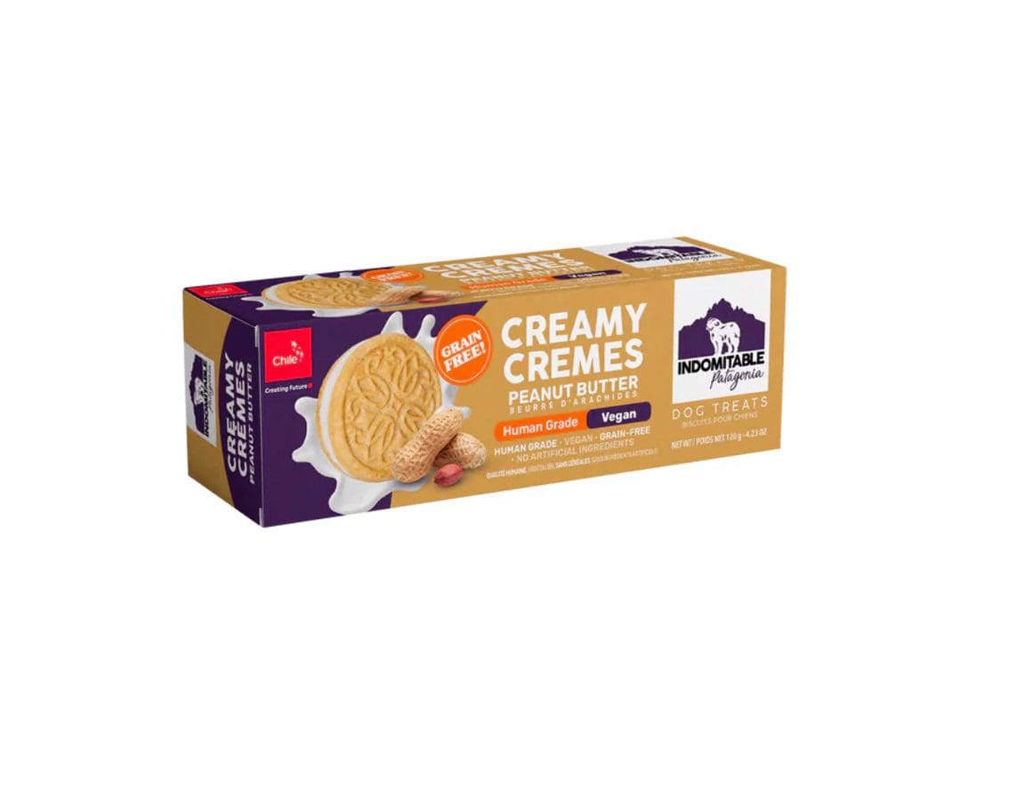 Indomitable Creamy Cremes vainilla y mantequilla de maní, son deliciosas y saludables galletas hechas con ingredientes super premium, no contienen cereales y están rellenas de una deliciosa crema que le encantará a su perro. Además, son horneadas lentamente en pequeñas cantidades para aumentar su chocancia. Perfectas para consentir a los perros de todas las razas.