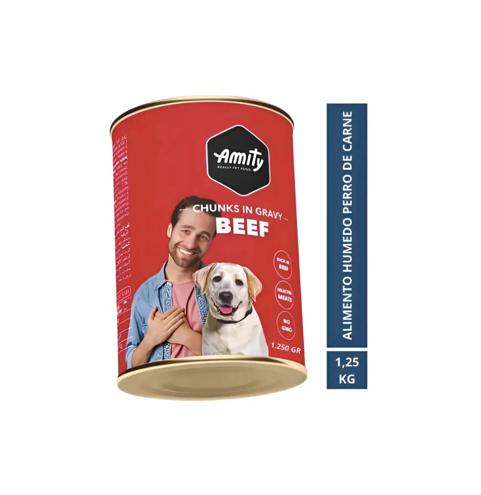 Fabricado En España / El Amity Premium Chunks in Gravy Carne es un alimento húmedo ideal para perros adultos, con trozos tiernos de carne cocinados al horno y bañados en salsa. Una receta irresistible que estimula incluso a los perros más exigentes o con bajo interés por el pellet.