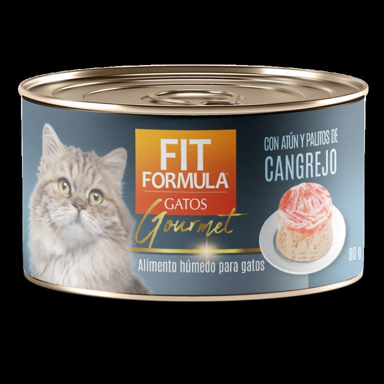 FIT FORMULA® GOURMET GATOS CON PALITOS DE CANGREJO es un alimento húmedo de exquisito sabor y textura, que contiene lomito de atún y palitos de cangrejo, una combinación insuperable de sabor, que entregará a su mascota una experiencia superior.