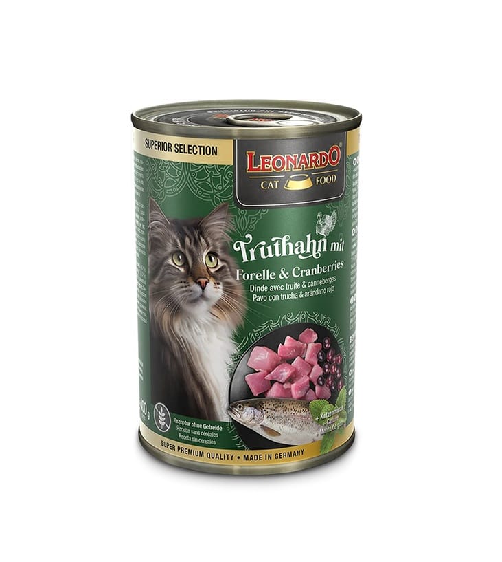 Fabricado En Alemania / Esta receta gourmet combina la proteína magra del pavo con la frescura del filete de trucha, creando una experiencia sabrosa, fácil de digerir y rica en nutrientes. Leonardo Pavo con Trucha y Cranberries está enriquecido con arándanos rojos, un superalimento con propiedades antioxidantes naturales.