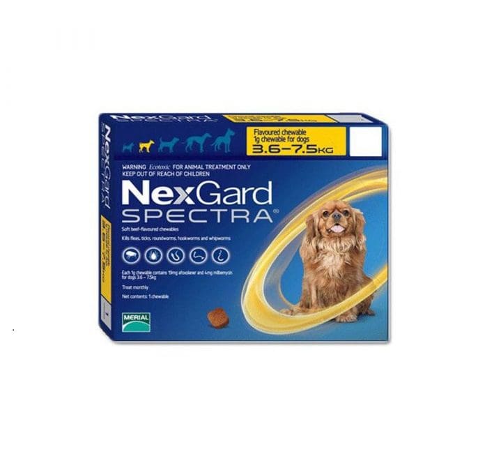 Nexgard Spectra 3.6 a 7,5Kg – 3 Comprimido es un antiparasitario masticable de amplio espectro que actúa sobre los principales ectoparásitos (pulgas y garrapatas) y los endoparásitos más frecuentes (vermes redondos, vermes gancho y vermes látigo). Nexgard Spectra 3.6 a 7,5Kg – 3 Comprimido está indicado para perros de 3,6 a 7,5 Kg de peso.