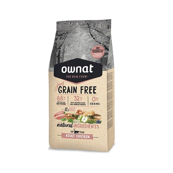 Ownat Grain Free Adult Cat- Chicken es un alimentos para gatos adultos de todas las razas. Formulado con un alto nivel de proteínas, adecuado para el organismo carnívoro del gato, su composición proporciona todos los nutrientes necesarios para una alimentación equilibrada. Sin cereales, Ownat Grain Free supone una alternativa nutricional que reproduce lo más exactamente posible la dieta que seguiría espontáneamente un gato viviendo en plena libertad en la naturaleza y para la cual está preparado su organismo. Sin colorantes ni conservantes.