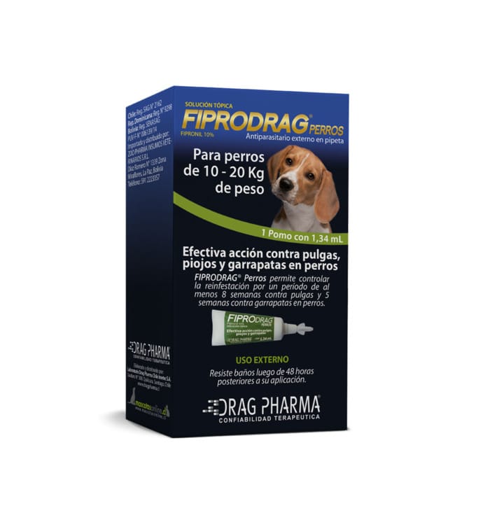 Fiprodrag® está indicado para el tratamiento y control de la infestación por pulgas, piojos y garrapatas en perros sobre 10 semanas de edad. Su uso además se recomienda como terapia complementaria de la dermatitis alérgica por pulgas en perros. En estos casos se recomienda la aplicación mensual, y además a los animales que cohabitan con ellos.