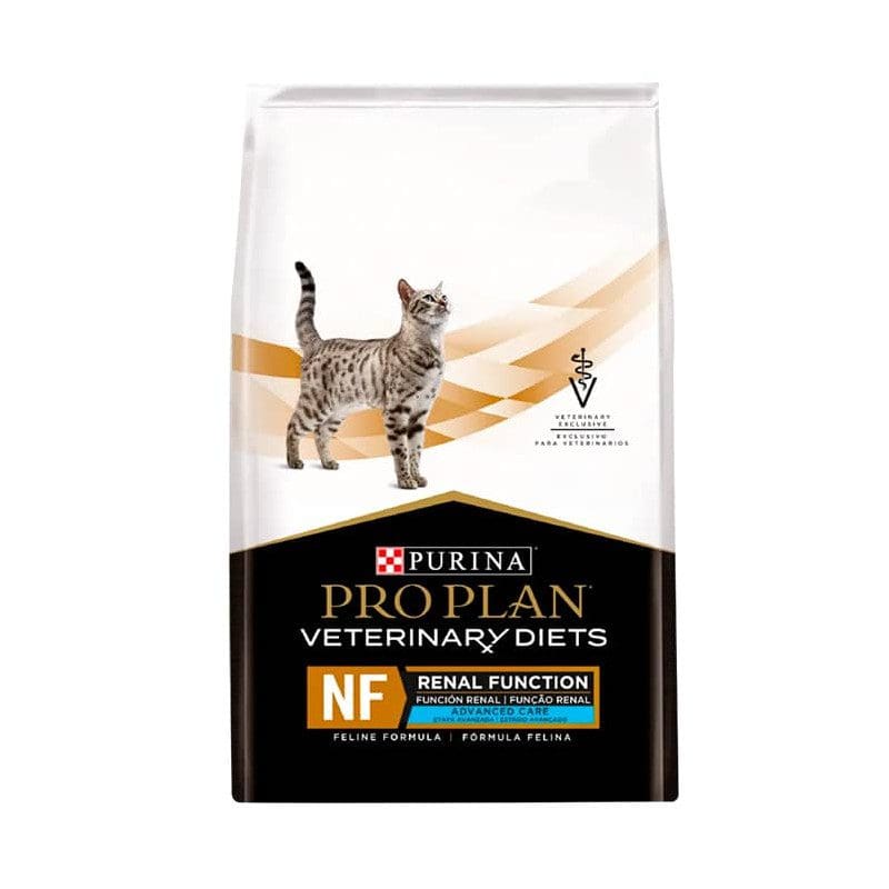 PRO PLAN® Veterinary Diets NF Función Renal – Etapa Avanzada es un alimento indicado para gatos adultos de todas las razas. Indicado como soporte nutricional al tratamiento médico de la enfermedad renal crónica en etapas avanzadas que requieren de una restricción proteica en su dieta. Este alimento también puede utilizarse en gatos con recidivas de urolitiasis por oxalato de calcio y con encefalopatía hepática. Fórmula mejorada que precisa transición alimenticia.