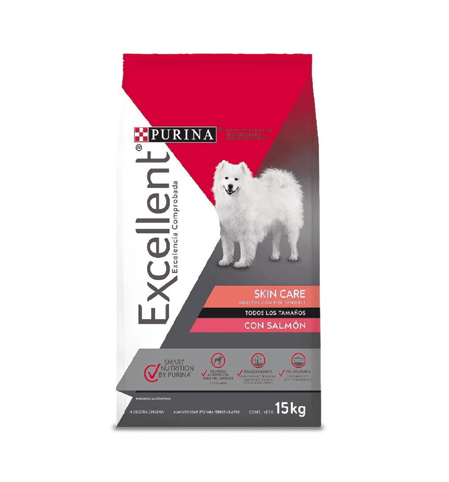 Purina Purina EXCELLENT® Adultos Piel Sensible con Salmón es un alimento completo y balanceado indicado para perros adultos de razas medianas y grandes hasta los 7 años de edad con pieles sensibles. Formulado con la proteína de salmón indicada para la piel sensible. esta fórmula cuida la piel y el pelaje de los perros.