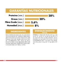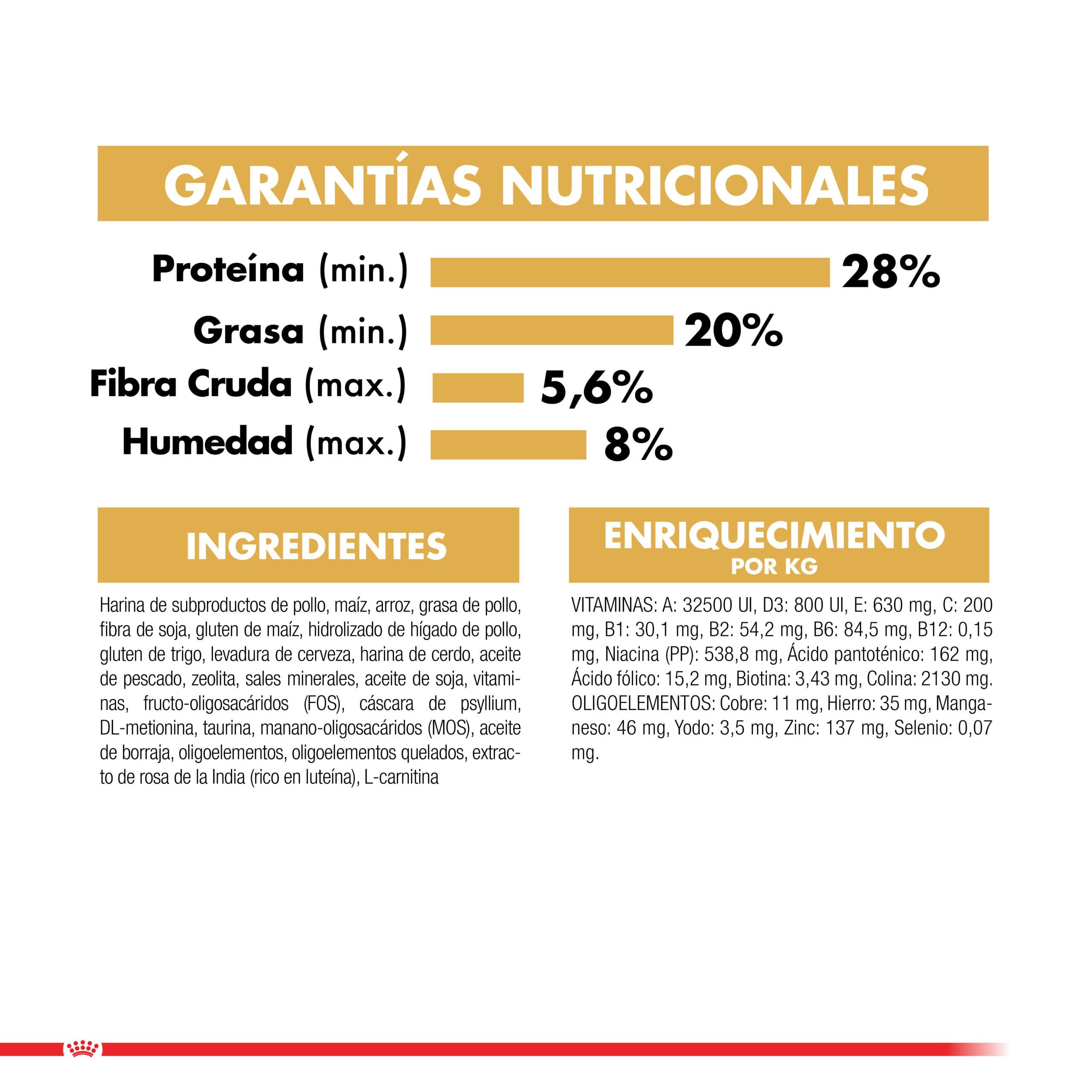 Harina de subproductos de pollo, maíz, arroz, grasas animales (pollo y cerdo), cáscara de arveja, harina de cerdo, gluten de maíz, gluten de trigo, pulpa de achicoria, aceite de pescado (fuente de ácidos grasos omega 3), aceite de soya, zeolita, sales minerales, levadura de cerveza, manano-oligosacáridos (MOS), cáscara de psyllium, aceite vegetal (con aceite de borraja), extracto de rosa de la India (rico en luteína), oligoelementos, fructooligosacáridos (FOS), oligoelementos quelados, vitaminas, L-lisina, DL-metionina, L-carnitina, taurina, hidrolizado de hígado de pollo.