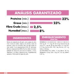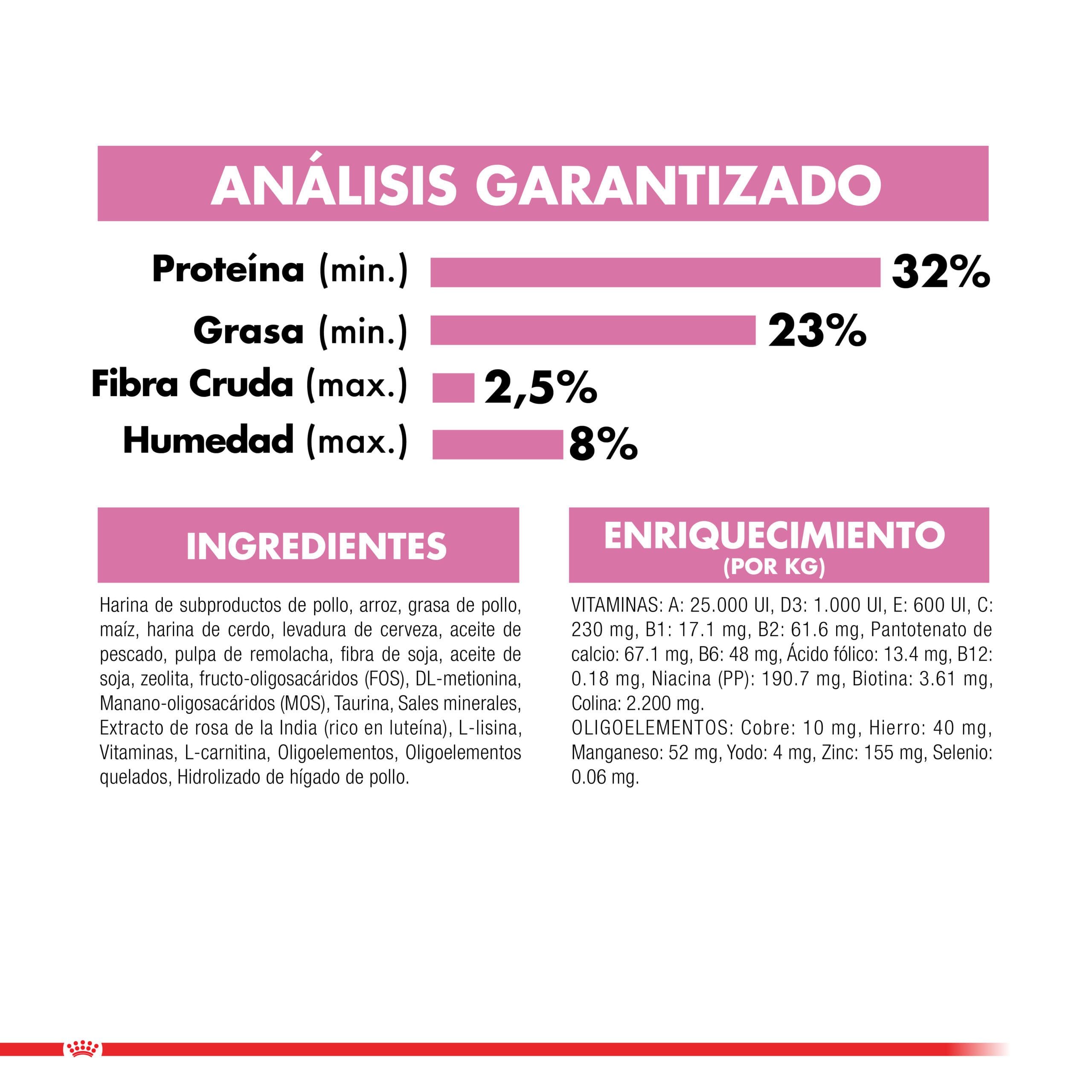 Proteína Bruta (mín.): 32%; Extracto etéreo (mín.): 23%; Fibra cruda (máx.): 3,9%; Minerales (máx.): 8,1%; Humedad (máx.): 7%; Calcio (mín.): 0,72%, (máx.): 1,68%; Fósforo (mín.): 0,6%, (máx.): 1,4%; Sodio (máx.): 0,6%. Energía metabolizable: 4.425 kcal/kg. Enriquecimientos por kg (mín.)”