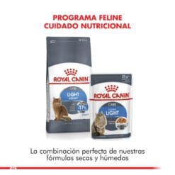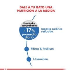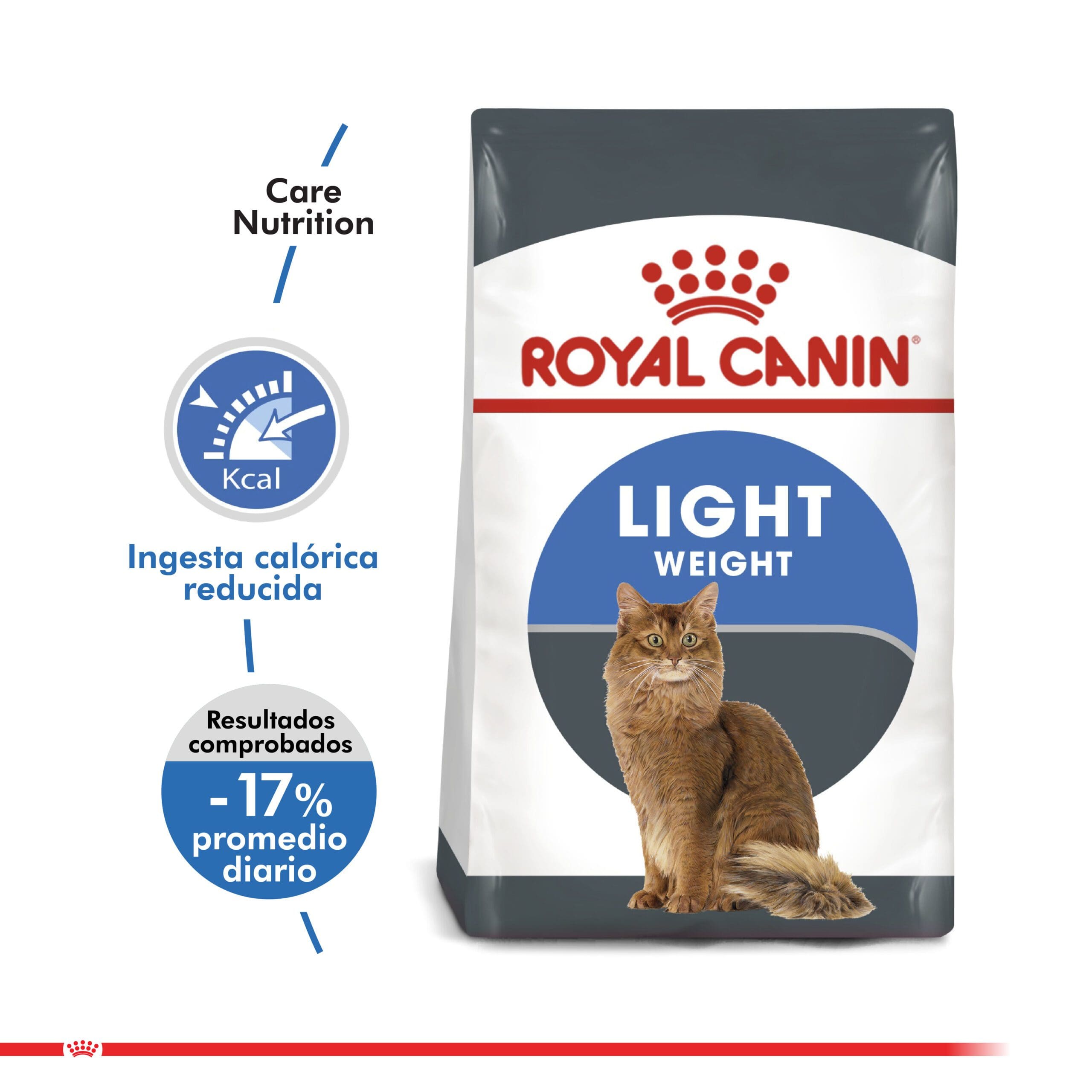 Royal Canin Light es un alimento formulado para gatos con sobre pesos, ofrece un 17% menos de calorías consumidas espontáneamente y el apetito del gato satisfecho. Eficacia Probada -17%