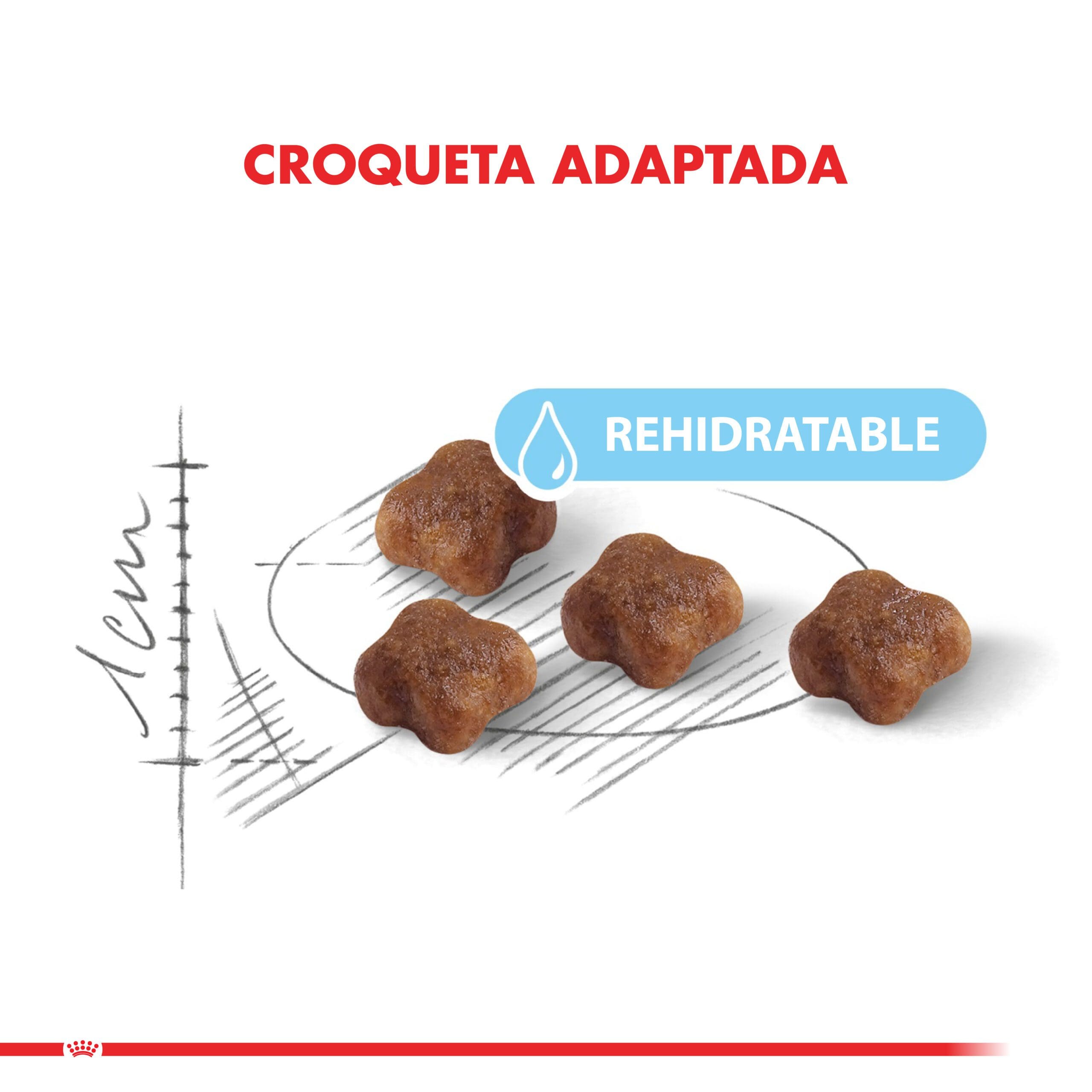 Croqueta adaptada que se rehidrata rápidamente para facilitar la transición de la leche al alimento seco.