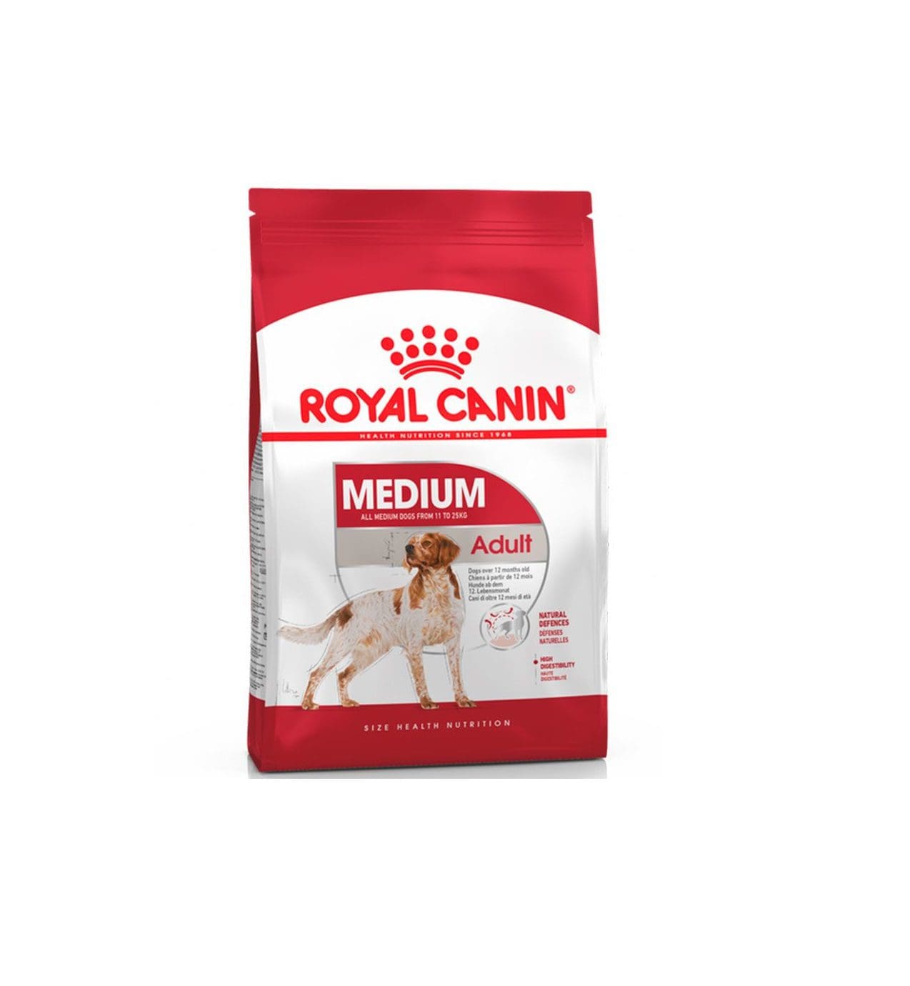 Fase adulta perros Medium (11-25 Kg). Producto indicado desde los 12 meses hasta los 7 años. Ayuda a mantener el peso ideal en la edad adulta. Reforzando las defensas naturales: Ayuda a mantener las defensas naturales de su perro gracias a los manano-oligosacáridos que estimulan la flora intestinal beneficiosa. Con ácidos grasos omega 3 (EPA y DHA), omega 6, zinc, vitamina A y biotina para proteger la piel y el pelo. También contiene vitaminas E y C para evitar la oxidación celular.