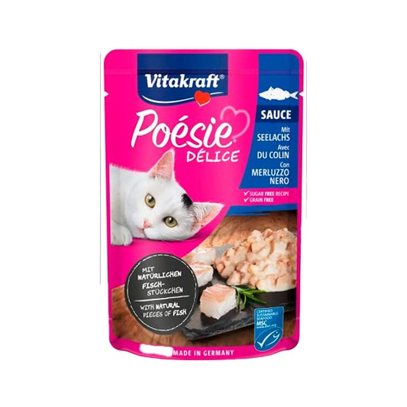 Estos exquisitos bocaditos van acompañados de una fina salsa que ofrece una suave textura que encantará a tu gato. ¡Todo tu amor está en esta bolsita de Vitakraft Poesie Delice Pescado!