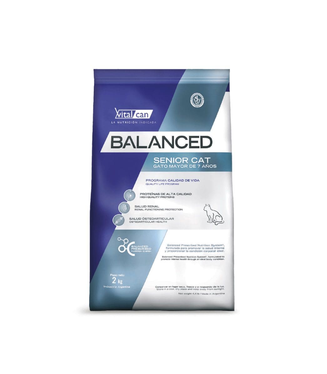 Vitalcan Balanced es ideal para gatos maduros mayores a 7 años porque su Programa Calidad de Vida les proporciona: Proteínas de alta calidad: necesarias para compensar el catabolismo proteico, propio de la edad avanzada, contribuyendo así al mantenimiento armónico de la masa muscular. Salud renal: formulado con bajos niveles de fósforo, colaborando en la prevención del daño renal. Salud osteoarticular: una excelente relación calcio/fósforo, combinada con glucosamina, vitamina C, sales de manganeso y metilsulfonilmetano, colabora con la salud de huesos y articulaciones y con la prevención de los riesgos de lesiones propios de la edad en gatos mayores de 7 años. Hairball control: el agregado de celulosa ayuda a prevenir la formación de bolas de pelo en el tracto gastrointestinal por efectos del lamido. Modulación de las defensas: formulado con vitamina C y nucleótidos de levadura que actúan como moduladores de las defensas, ayudando a conferir una óptima respuesta inmunológica.