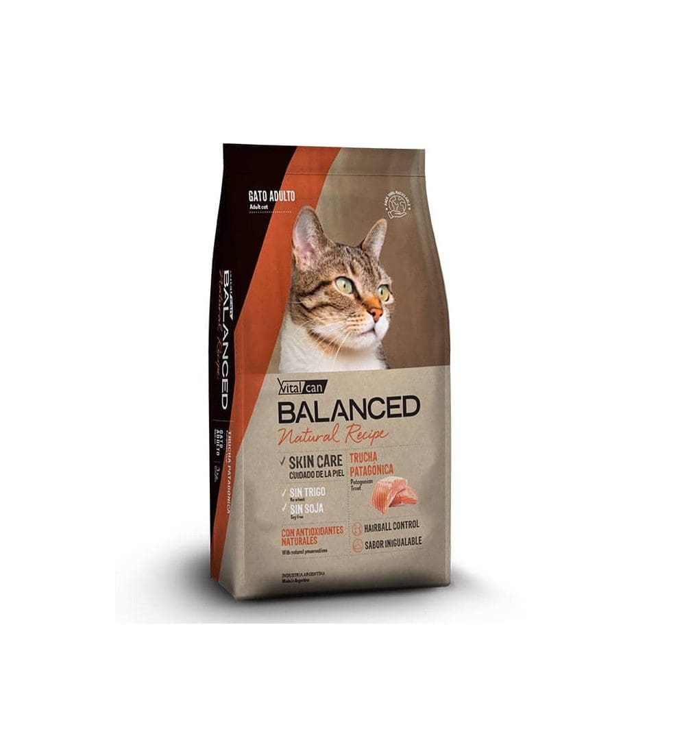 Fabricado En Argentina / Vitalcan Balanced Natural Recipe Trucha es un alimento para gatos adultos de todas las razas con y sin sensibilidad digestiva y/o cutánea. Con una única fuente de proteína de origen animal a base de trucha que contribuye a reducir las reacciones alérgicas. El plus de Omega3 ayuda a mejorar la condición de la piel y los signos digestivos de la intolerancia alimentaria. Con el agregado de hexametafosfato para ayudar a prevenir el desarrollo de sarro dental. Los prebióticos favorecen el desarrollo de bacterias benéficas del intestino, lo que contribuye a mejorar la absorción intestinal, lograr un proceso digestivo óptimo y aumentar las defensas naturales. Su balance de proteínas y minerales colaboran en alcanzar un ph urinario óptimo manteniendo un tracto urinario saludable.