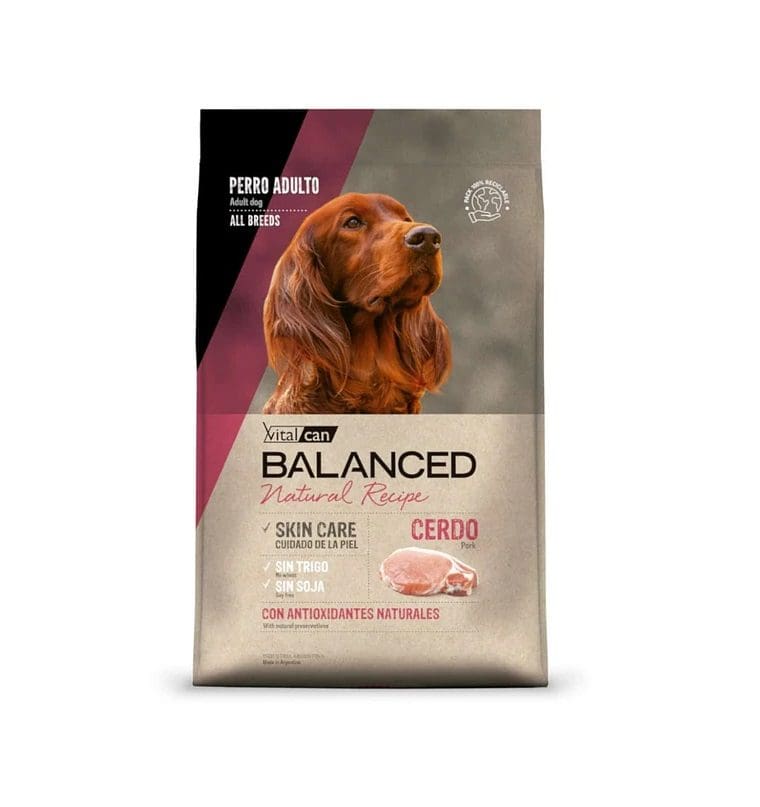 Vitalcan Balanced Natural Recipe Cerdo es un alimento indicado para perros adultos de todas las razas con y sin sensibilidad digestiva y/o cutánea. Con una única fuente de proteína de origen animal (cerdo) que ayuda a minimizar las posibles reacciones al alimento en perros alérgicos y/o intolerantes alimentarios. Enriquecido con Omega 3 y 6, ácidos grasos esenciales fundamentales para el mantenimiento de una piel sana, humectada y un pelaje brillante. Con el agregado de hexametafosfato de sodio para ayudar a prevenir el desarrollo de sarro dental. Con prebióticos que favorecen el desarrollo de bacterias benéficas del intestino lo que contribuye a mejorar la absorción intestinal, lograr un proceso digestivo óptimo y aumentar las defensas naturales.