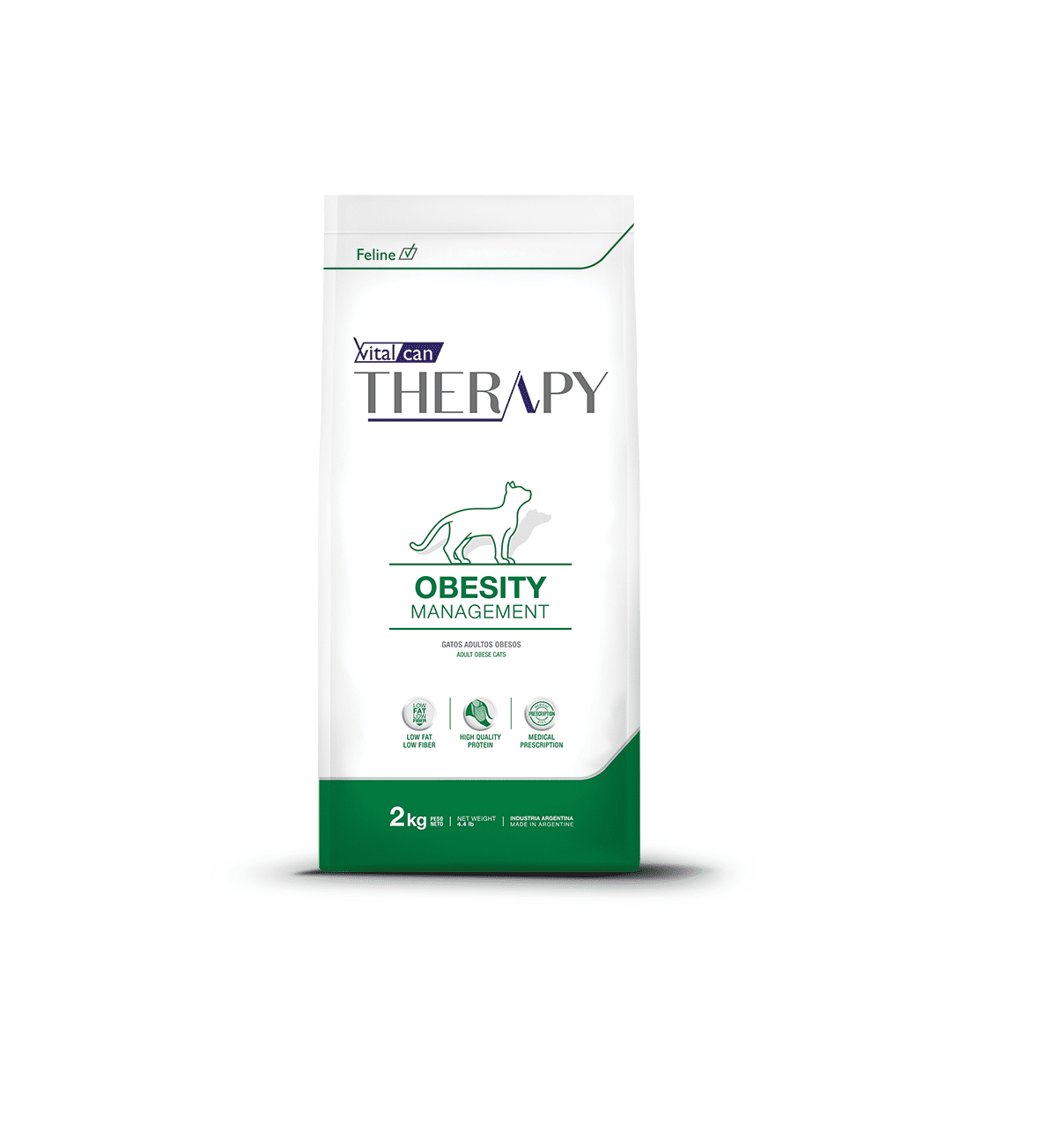 VITALCAN THERAPY FELINE OBESITY MANAGEMENT es un alimento completo de prescripción para gatos adultos obesos o con sobrepeso, formulado con un reducido nivel de calorías y un adecuado aporte de fibras dietarias, que colabora en el descenso del peso corporal del gato.